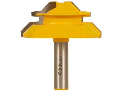 | Use the reversible 45° lock miter glue joint router bit to join boards at 90°. The interlocking 45° cuts will produce extremely strong joints without having to struggle to keep the boards in place during clamping. Additionally, it will provide extra gluing surface resulting in an extremely strong and durable joint. When positioned properly, the bit will cut both pieces of stock without having to adjust the bit. Simply set the center of the stock to the center of the bit. Then, cut one piece horizontally and the second one vertically. Use with stock ranging from 1/2" to 1-1/8". Two flute carbide cutters & 1/2" shank. ...Read
